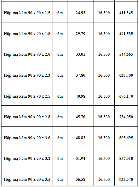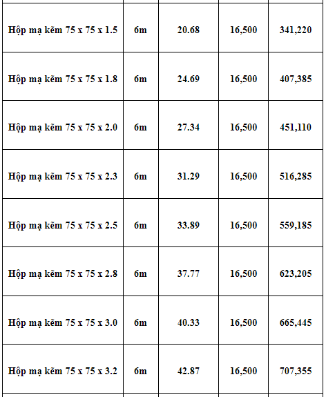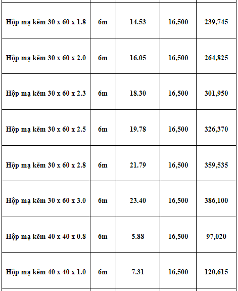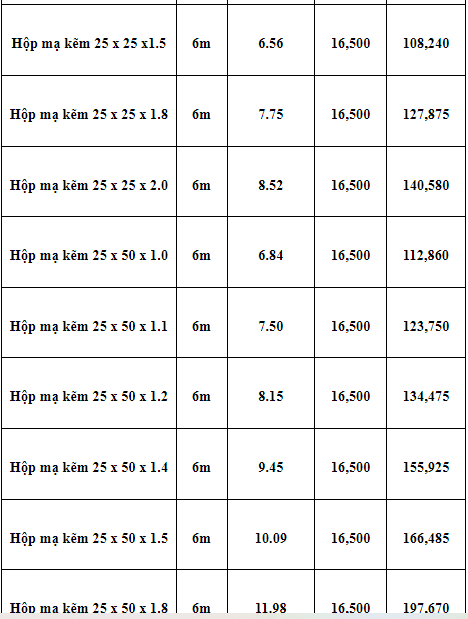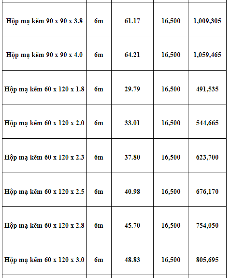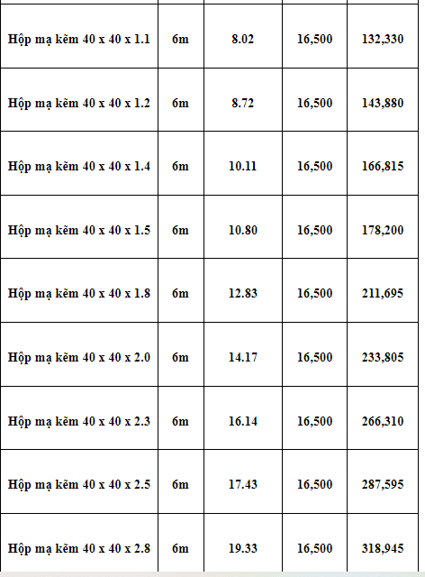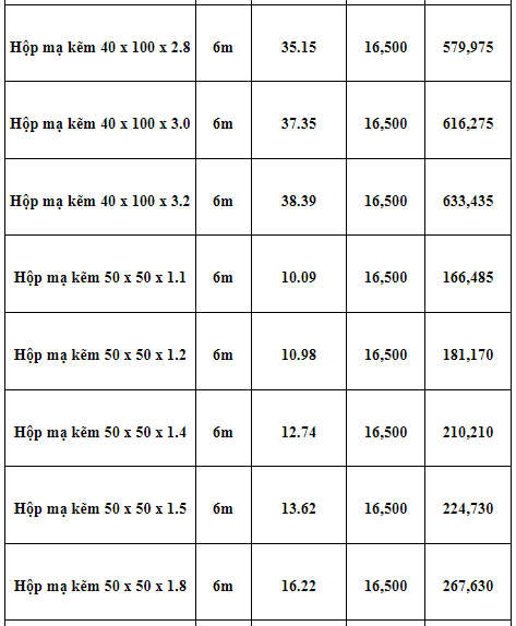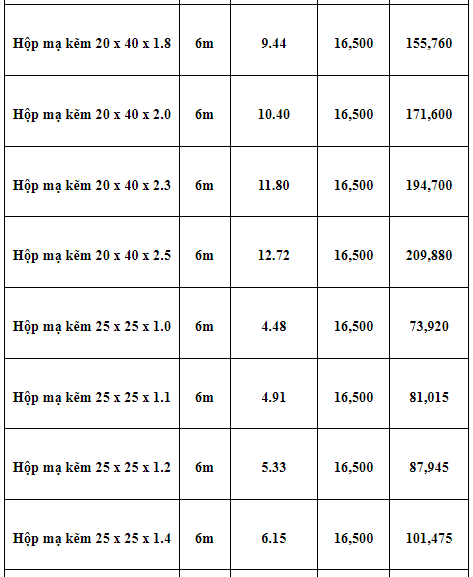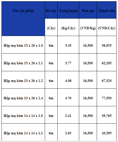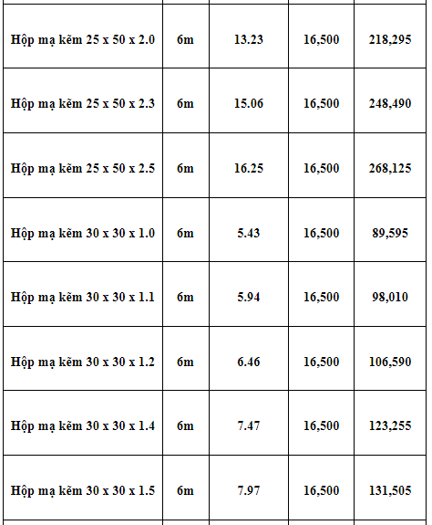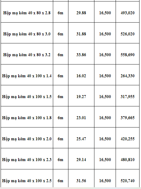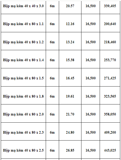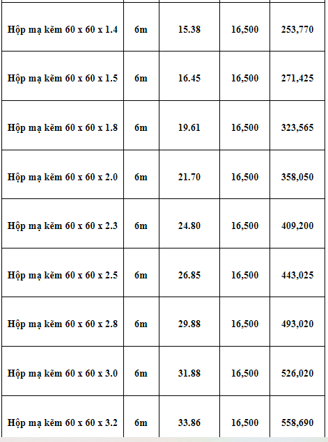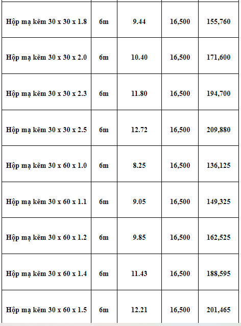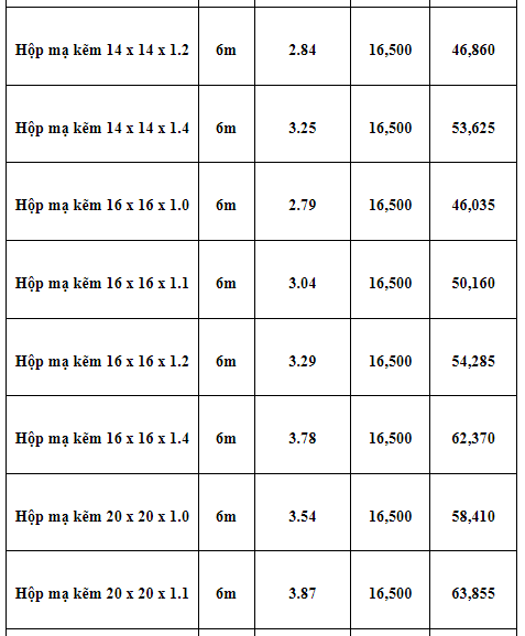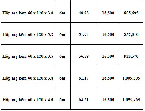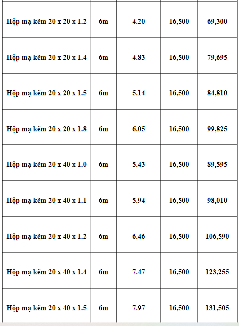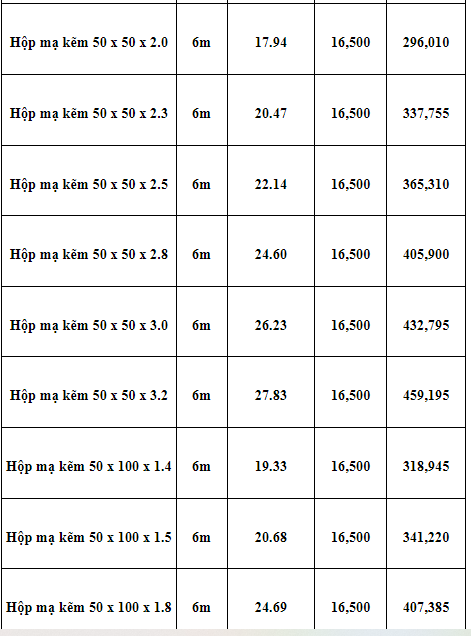 Dưới đây là bảng giá sắt hộp mạ kẽm mới nhất hiện nay được VLXD Duy Nam cập nhật cho quý khách hàng tham khảo. Để biết chính xác về giá, liên hệ ngay với chúng tôi để được tư vấn và báo giá nhanh nhất, chính xác nhất.